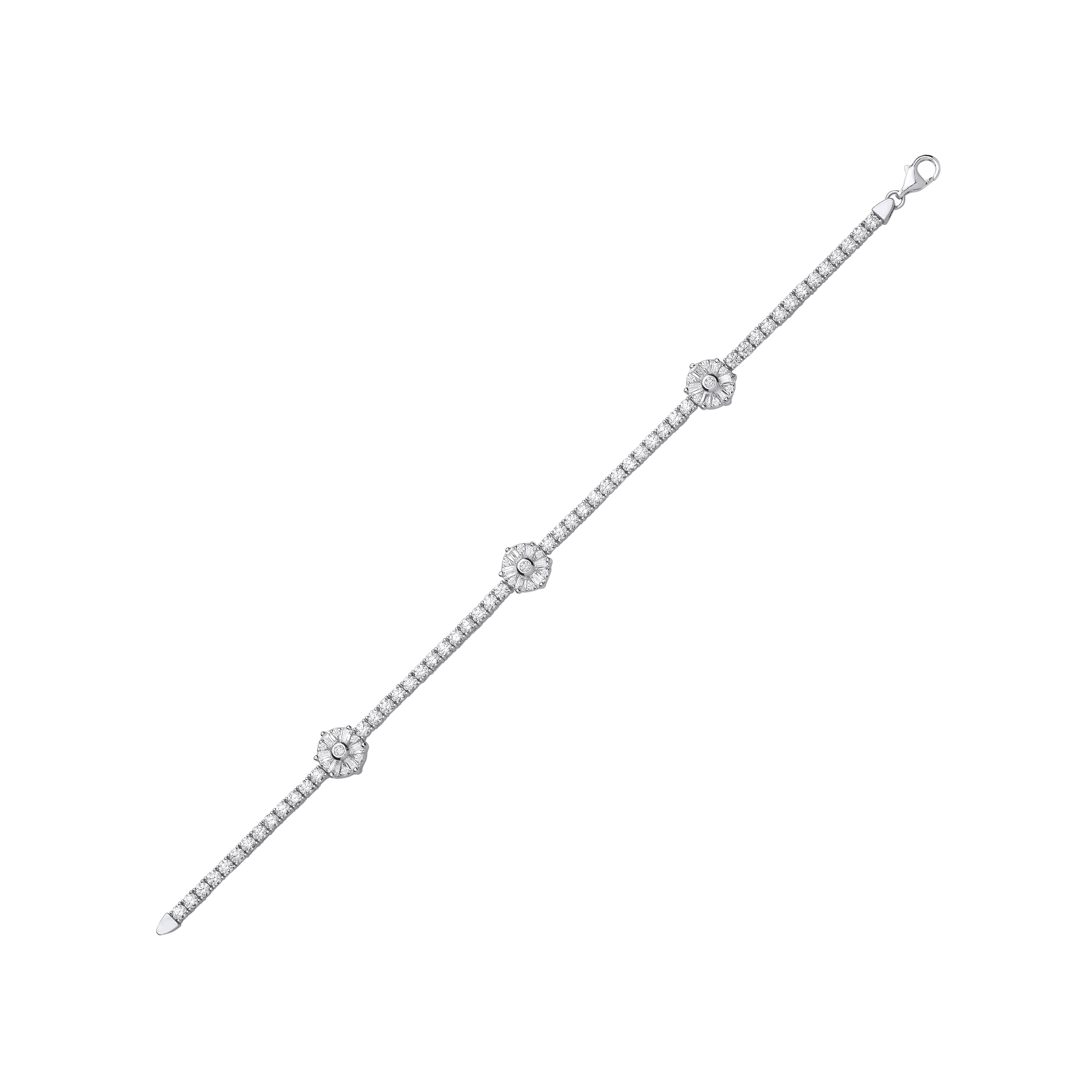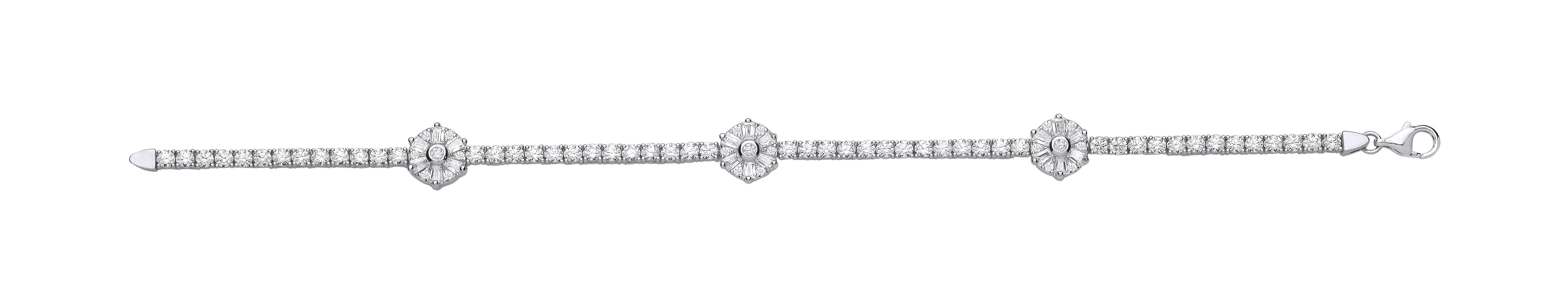 925 Sterling Silver CZ Round & Baguette Clawset Flower Tennis Bracelet